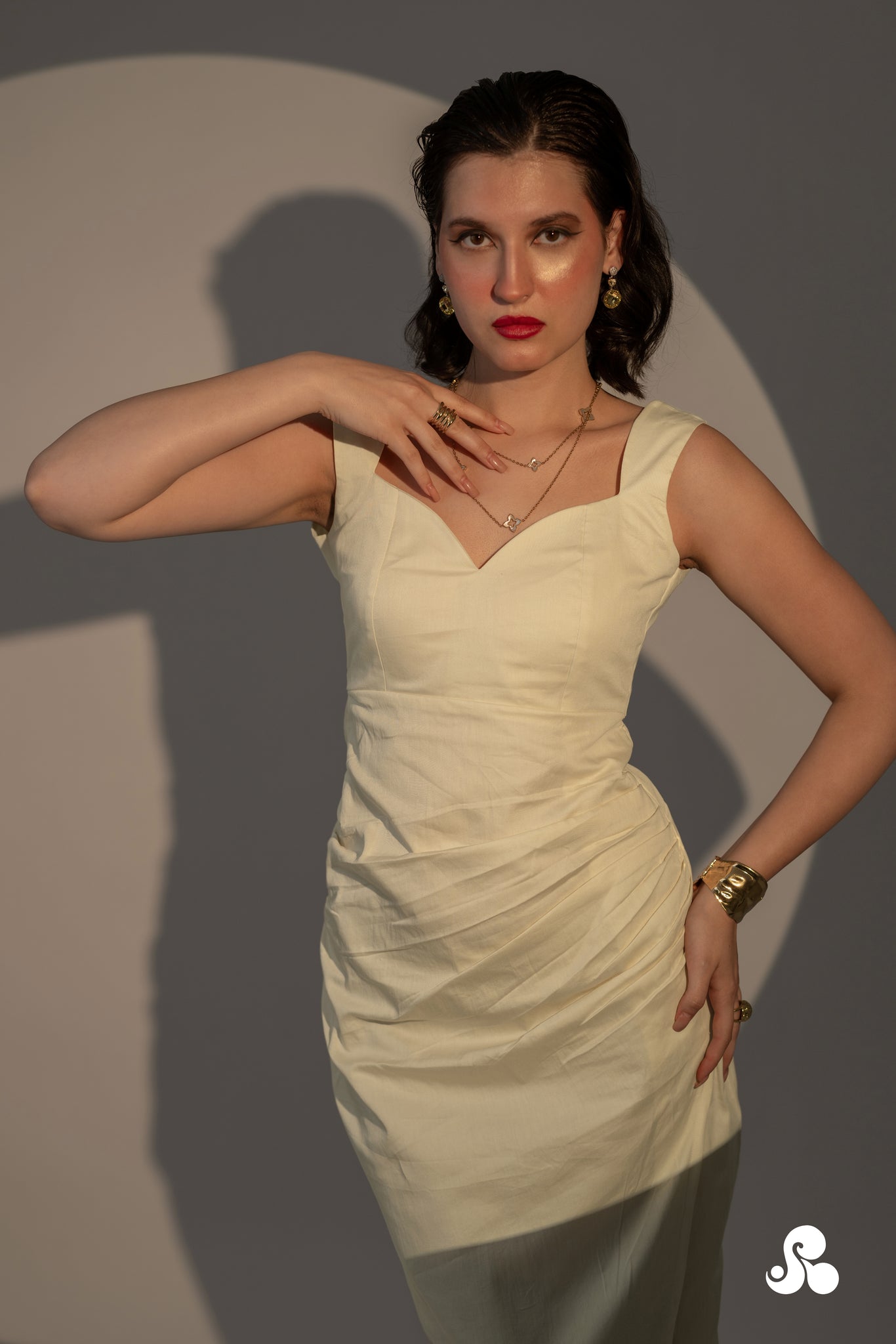 ELEGANT. STRUCTURED. MADE IN LUXE COTTON SATIN WITH A FLATTERING RUCHED WAIST AND THIGH-HIGH SLIT. PERFECT FOR EVENINGS THAT DEMAND EFFORTLESS STYLE.